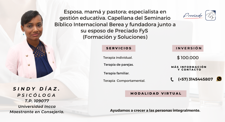 y estoy para ayudarte, soy psicóloga, pero también esposa, mamá, pastora y docente, disfruto todo lo que hago y mi objetivo aquí es proporcionarte un servicio de calidad, donde te sientas escuchado, comprendido y valorado, deseo agregarte todo el valor que me sea posible.